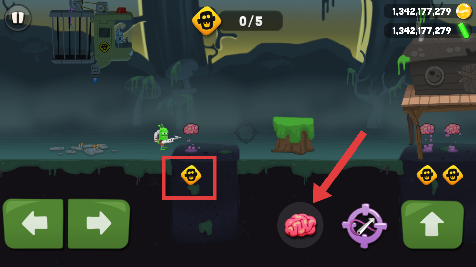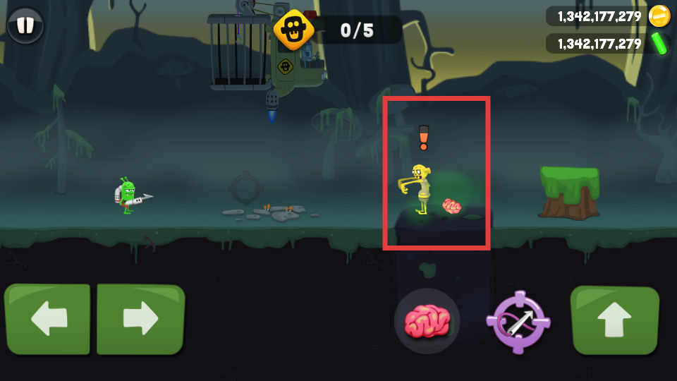 1、进入游戏后,找到方框内僵尸躲藏的位置后点击【大脑】,将大脑扔出进行诱惑僵尸。