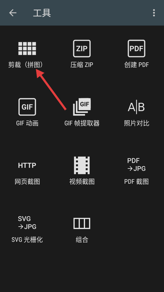 2、在【工具】界面,点击【剪裁(拼图)】选项,可进入图片剪裁拼图操作页。