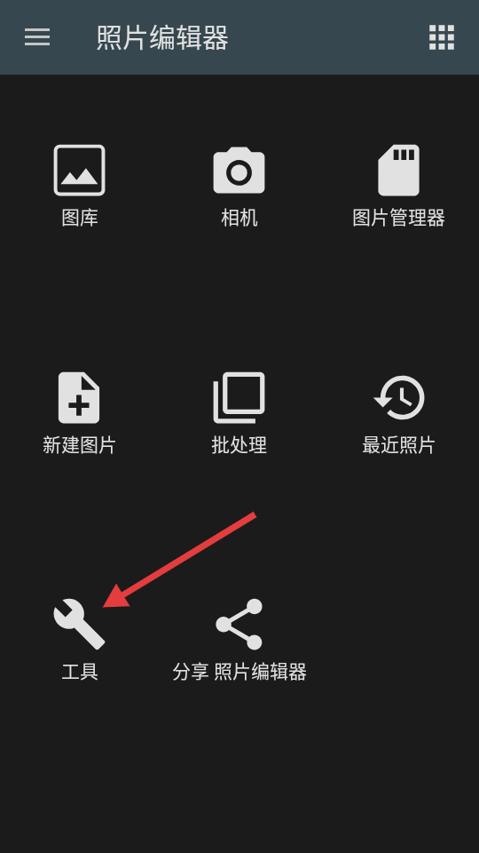 1、在【照片编辑器】界面,点击【工具】选项,可进入工具功能列表页。