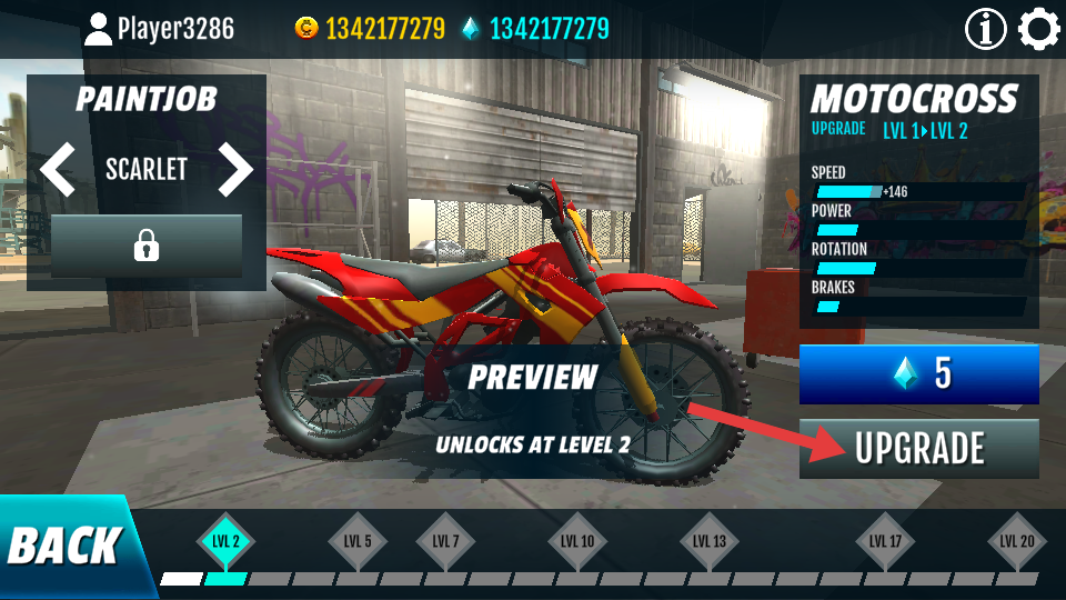 1、升级摩托车,提升速度、力量等属性,增强摩托车性能,更好应对赛道挑战。