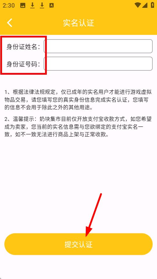 4、在【实名认证】页面填写【身份证姓名】【身份证号码】,点击【提交认证】完成实名认证。