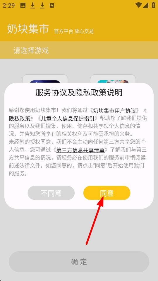 1、在服务协议及隐私政策说明弹窗中点击【同意】,即可继续使用奶块集市服务。