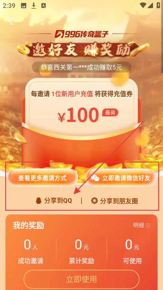 3、在邀请页面,可选择分享到QQ、朋友圈等渠道,邀请好友参与活动啦。