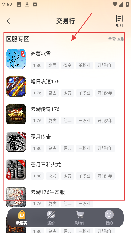 1、在交易行页面,可浏览区服专区的各类游戏区服,找到想要交易的区服啦。