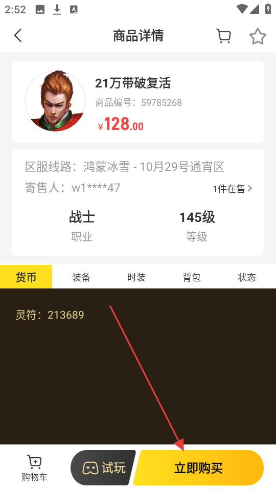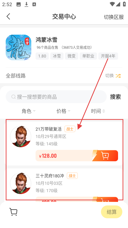 2、点击进入目标区服的交易中心后,可浏览在售商品,找到心仪的商品哦。