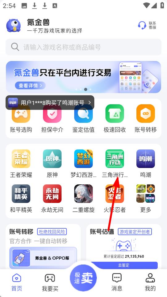 1、打开氪金兽应用后,可点击【三角洲行动】图标进入对应的游戏账号交易板块。