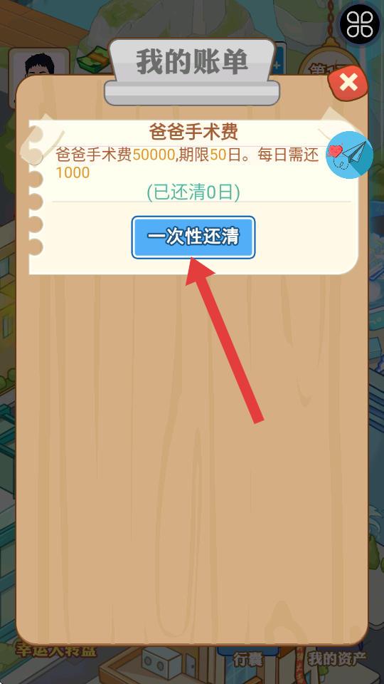 2、查看需要偿还的债务(如爸爸手术费),点击选择【一次性还清】来处理债务,减轻经济压力。