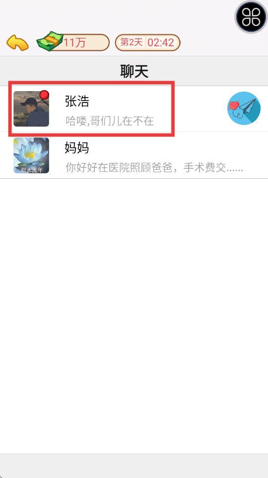 4、在聊天界面中,关注带有红点提示的联系人(如张浩),与其对话推进剧情。