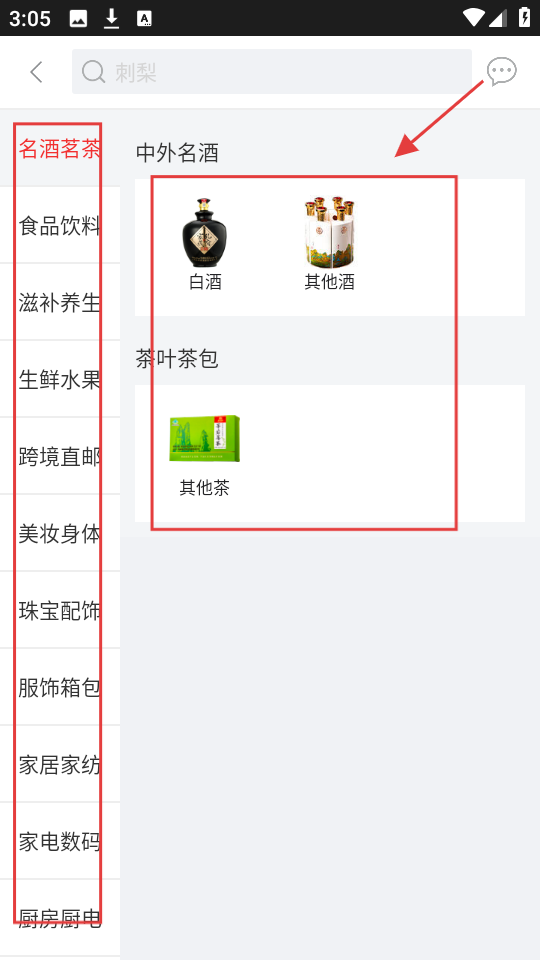 2、进入分类页面后,可选择名酒茗茶等分类,再选择具体商品类别,如白酒、其他酒等哦。