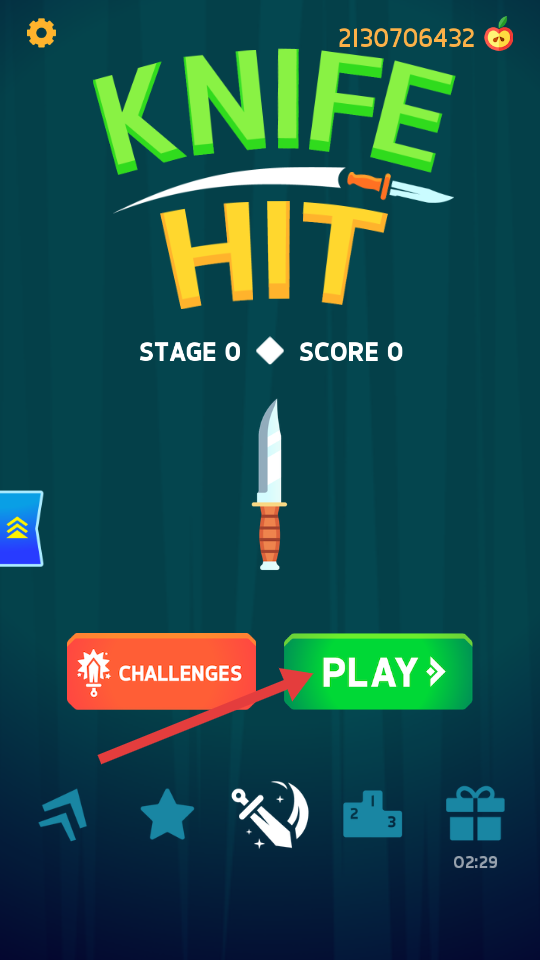 1、点击【PLAY】开始游戏,进入扔刀挑战,开始逐步提升关卡。