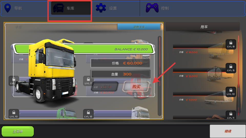 1、在车库界面,查看余额【€】-【10000】与卡车价格【€】-【60000】,积累资金后购买高属性卡车,提升运输效率。