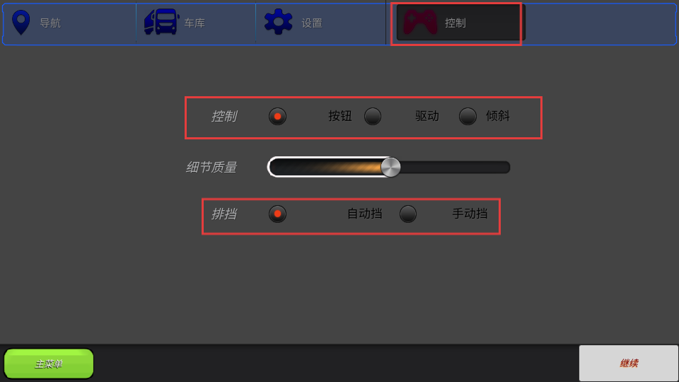2、进入控制设置,依据操作习惯选择控制方式(按钮、驱动、倾斜),排挡选自动或手动,调节细节质量优化画质。