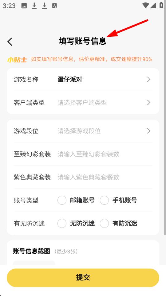 4、在【填写账号信息】页面,如实填写【蛋仔派对】的客户端类型等信息并提交,可提升估价精准度和成交速度。