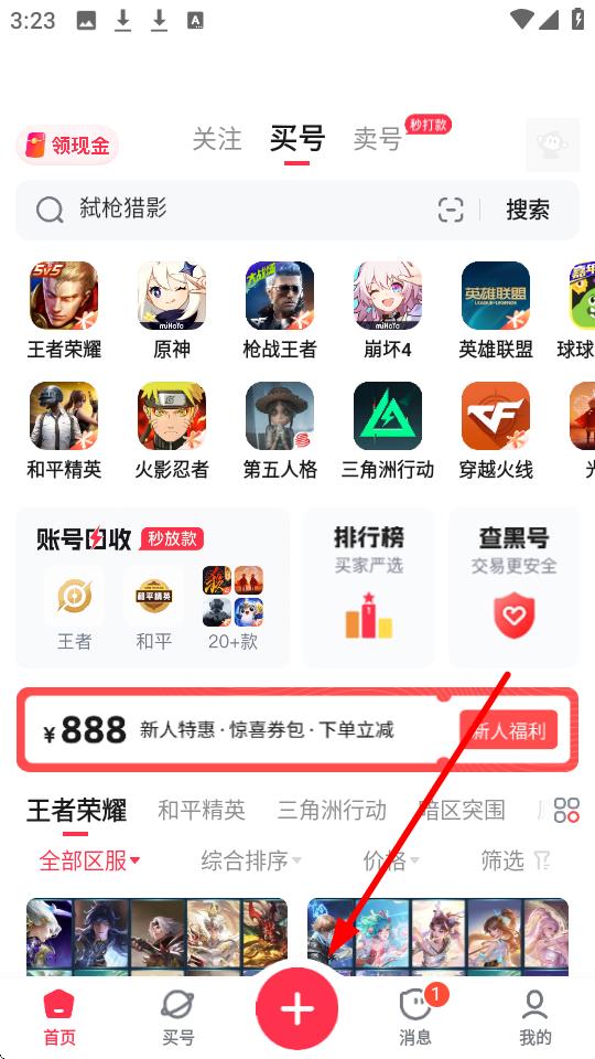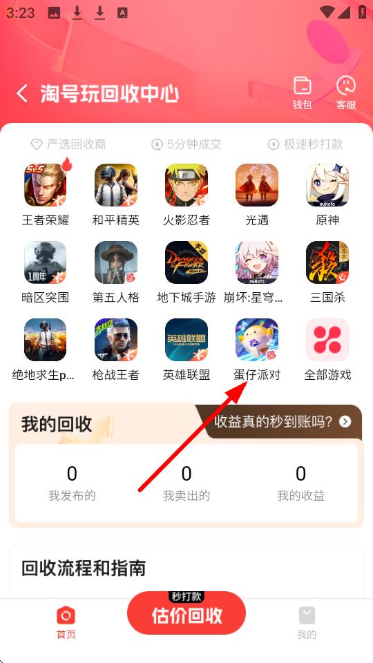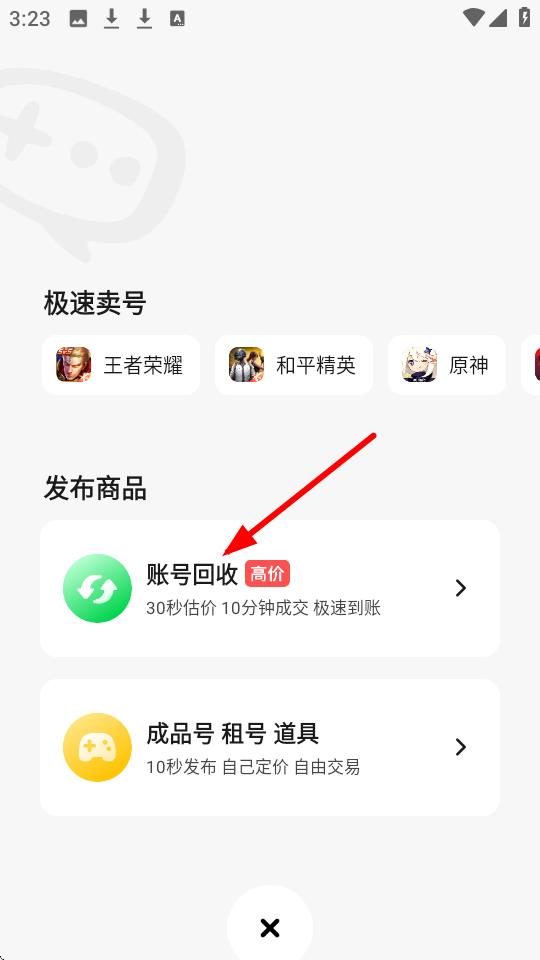 2、点击【账号回收高价】选项,可参与30秒估价、10分钟成交的账号回收流程。