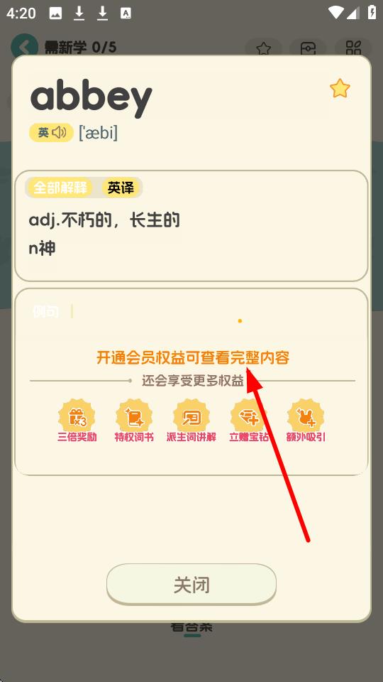 4、遇到【开通会员权益可查看完整内容】的提示,若想查看完整例句等内容,可考虑开通会员。