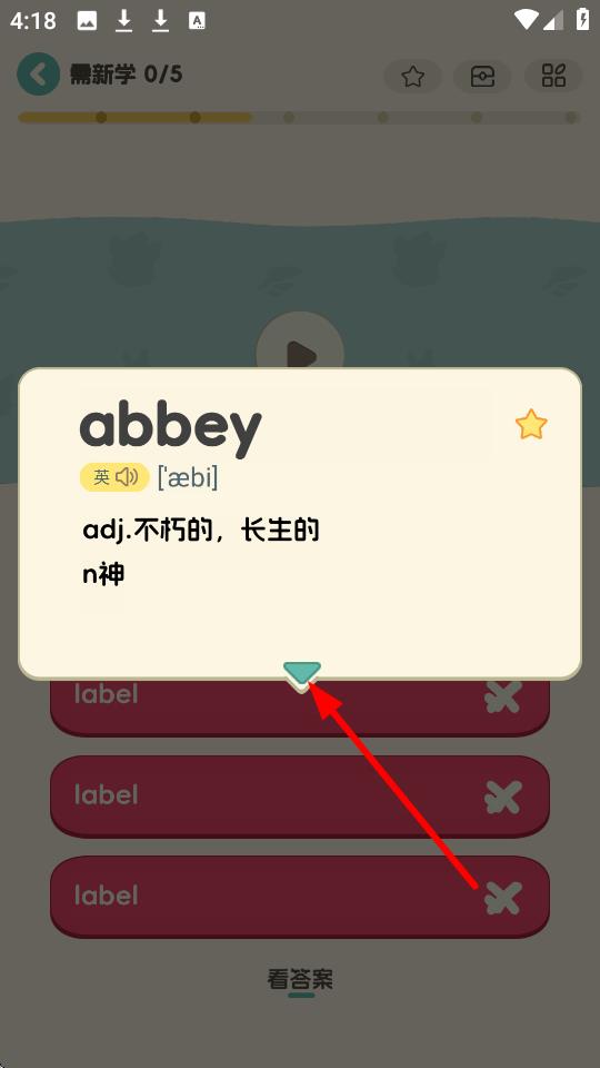 3、看到单词【abbey】的解释框,点击下方三角箭头可展开内容。