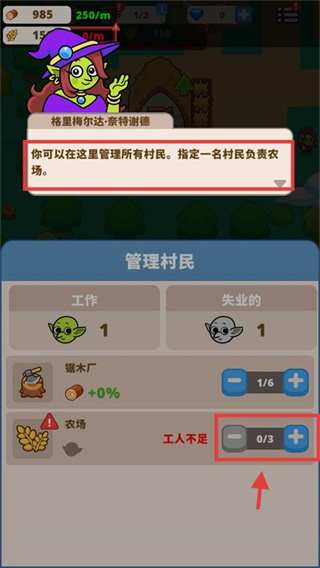 1、在管理村民界面,农场工人不足时,从失业村民分配,点农场旁【+】号加工人,保障食材生产。