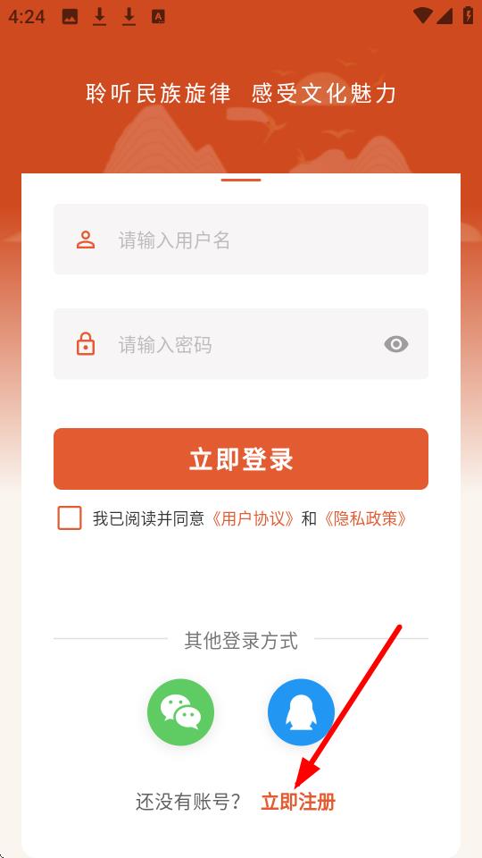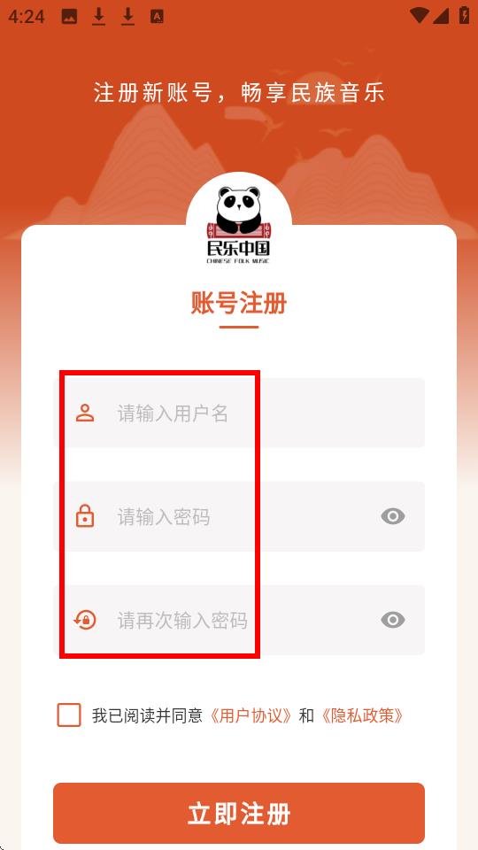 4、在账号注册页面,依次输入用户名、密码,勾选协议后点击【立即注册】即可完成注册。
