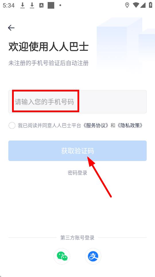 3、在【欢迎使用人人巴士】界面,输入手机号码,勾选同意协议后点击【获取验证码】。