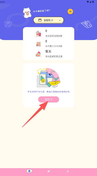 《奶茶打卡》界面以温馨的米色与紫色为主调,搭配手持奶茶杯的卡通小熊形象,风格轻松活泼。核心功能聚焦于记录每日奶茶饮用习惯,通过顶部的黄色加号按钮便捷添加记录。软件自动统计并清晰展示本月连续打卡天数、累计打卡天数及最常选择的奶茶品牌等数据。其优势在于将打卡记录与数据可视化结合,培养有意识的饮用习惯。