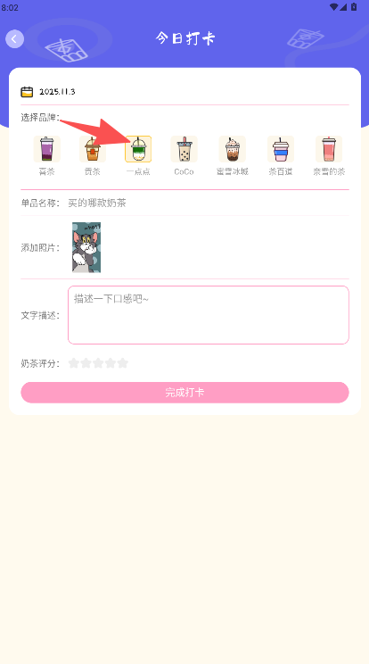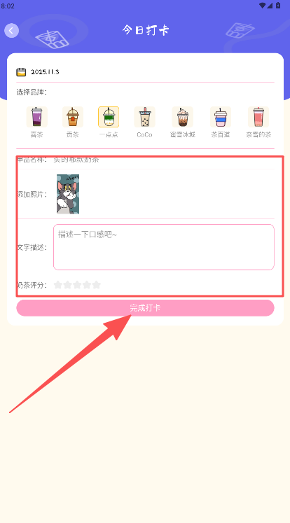 3、依次填写单品名称、添加奶茶照片、撰写口感描述并星级评分,点击“完成打卡”。