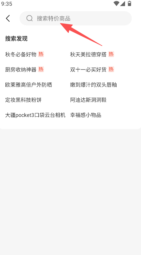 3、使用搜索功能,输入关键词或选择搜索发现的热门分类,查找特价商品。