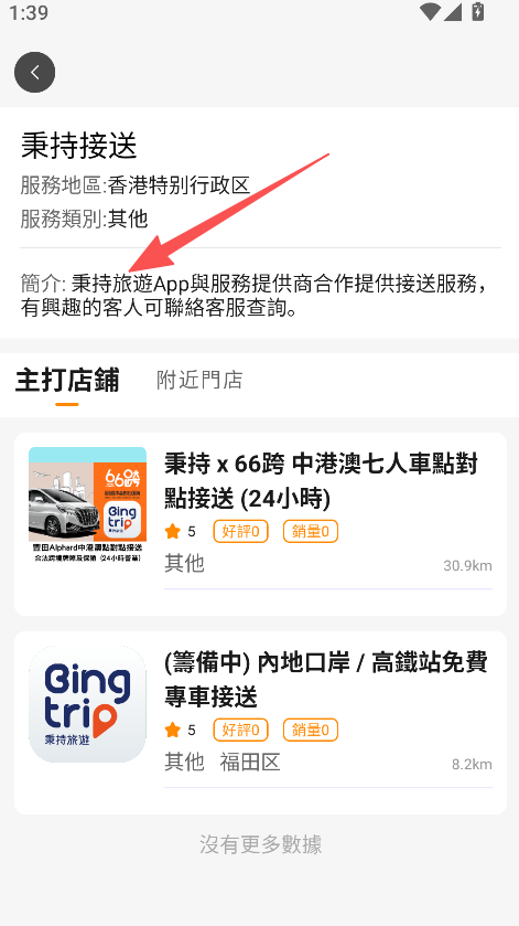 1、打开软件,点击秉持接送,查看服务详情(服务地区、店铺)。