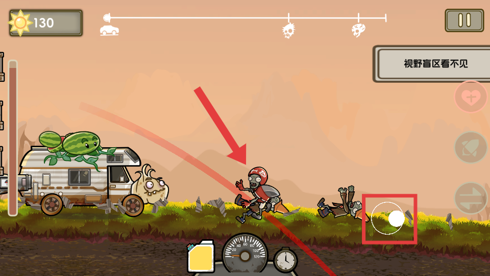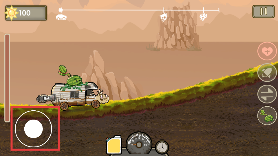 2、在游戏中,长按左侧交互区域,控制植物战车移动,躲避障碍物并接近僵尸。