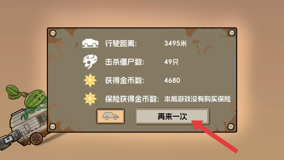 4、游戏结束后,可查看行驶距离、击杀僵尸数、获得金币数等数据,点击【再来一次】按钮,继续挑战以刷新成绩。