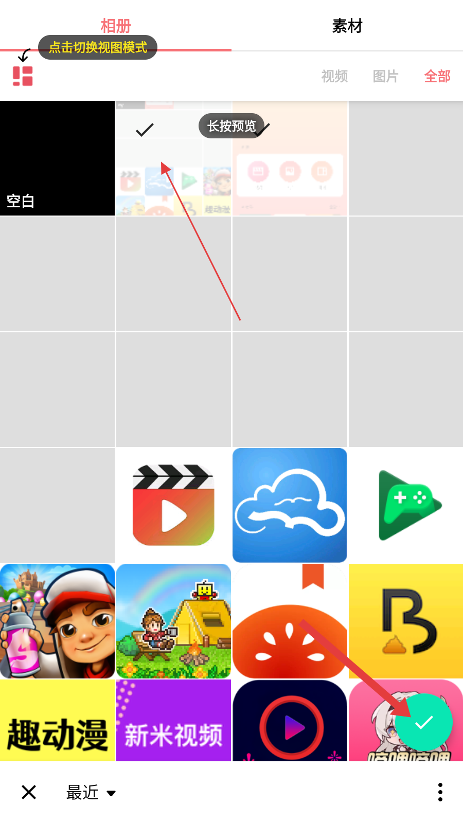 2、在视频选择页面【选择目标视频】,点击【对钩】进入视频编辑页面。