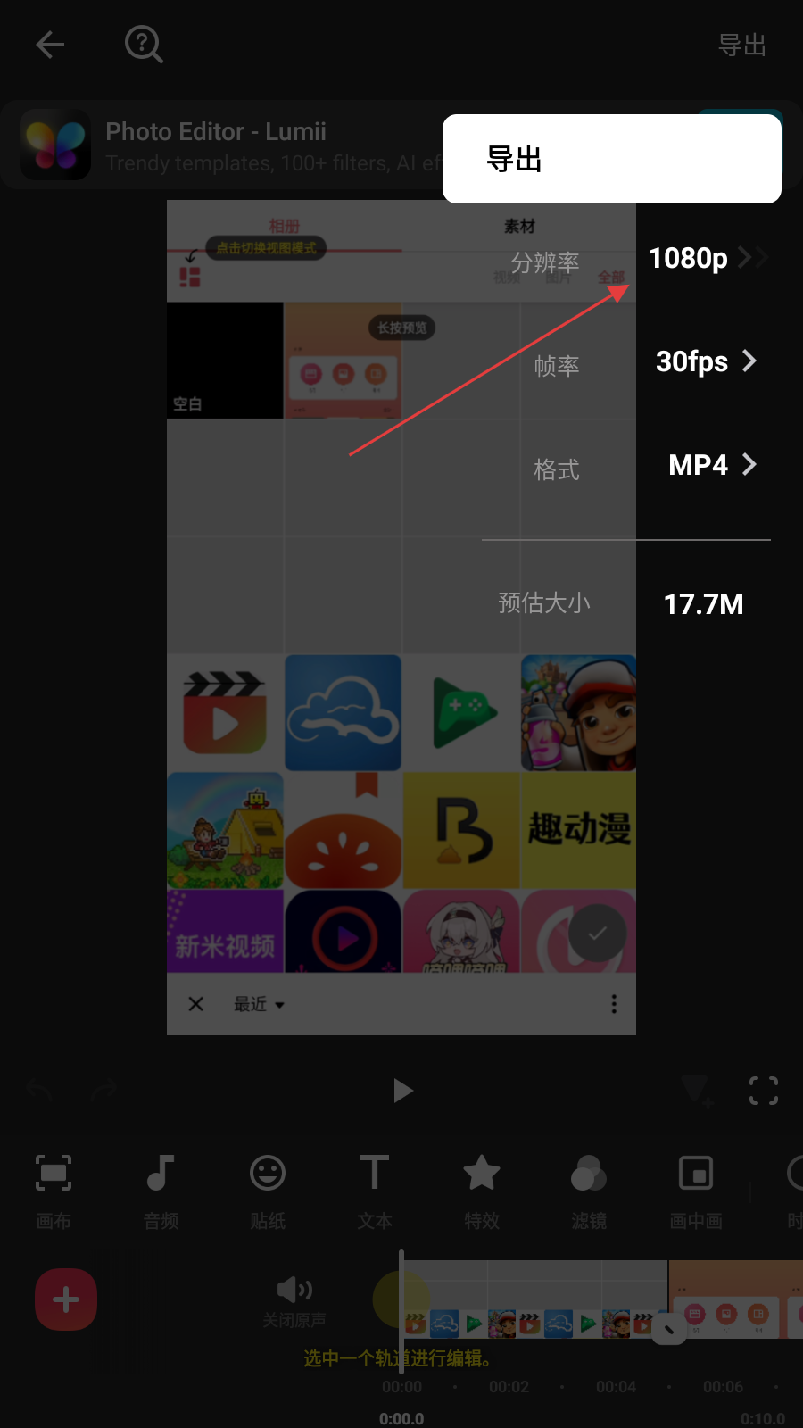 3、在视频编辑页面【完成编辑】后,点击【导出】,弹出导出设置弹窗。