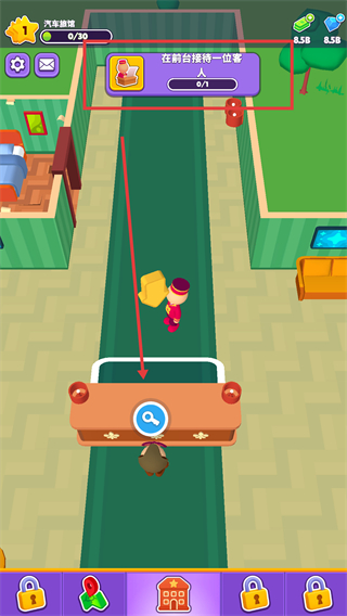 1、完成【在前台接待第一位客】任务,移动角色到前台,触发接待流程推进游戏进度。