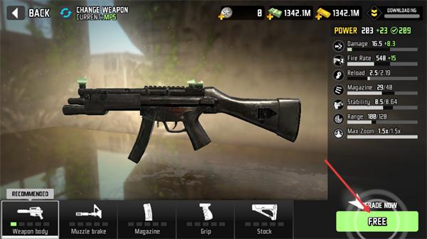 2、在武器升级界面,点击“UPGRADENOW”(免费升级),提升武器属性(如威力从203升至226),增强战斗能力。