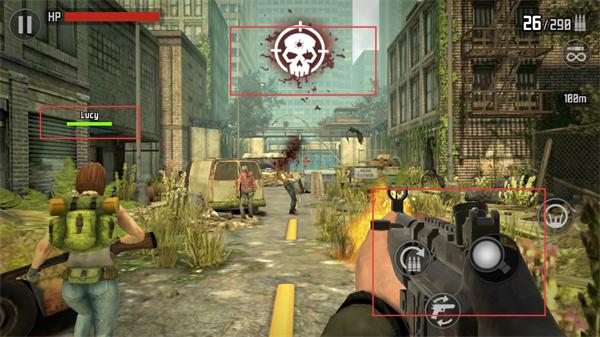 4、进入关卡后,跟随Lucy移动,瞄准敌方单位开火,红色骷髅标识统计击杀数,同时利用升级后的武器高效清理敌人。