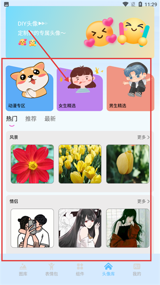 2、进入头像库板块后,可选择【动漫专区】等分类,这里以【女生精选】为例,点击该分类标签。