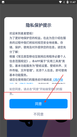 1、打开麦麦壁纸APP后,会弹出【隐私保护提示】,点击【同意】,即可进入软件主界面。