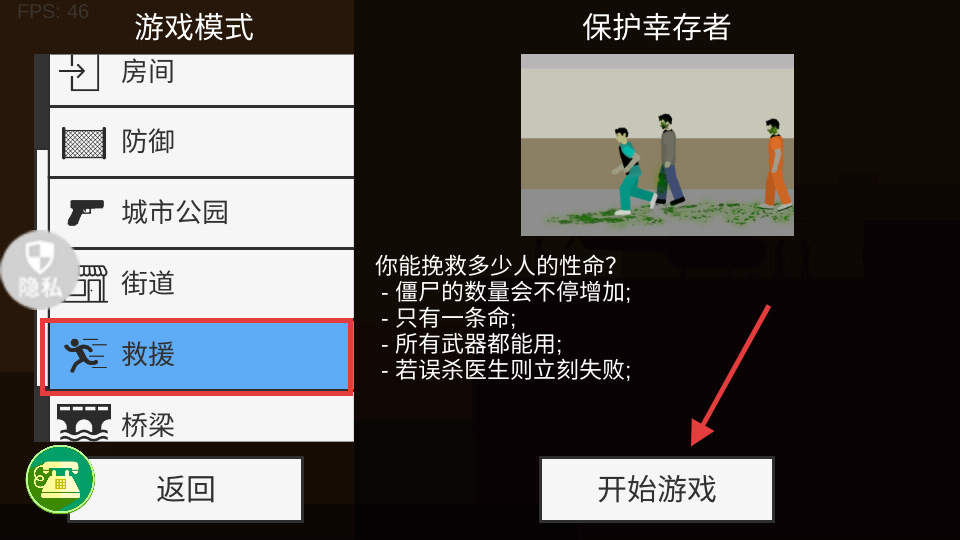 1、选择【救援】模式,了解规则(僵尸增量-只有一命-武器可用-不误医),点击【开始游戏】开启救援。