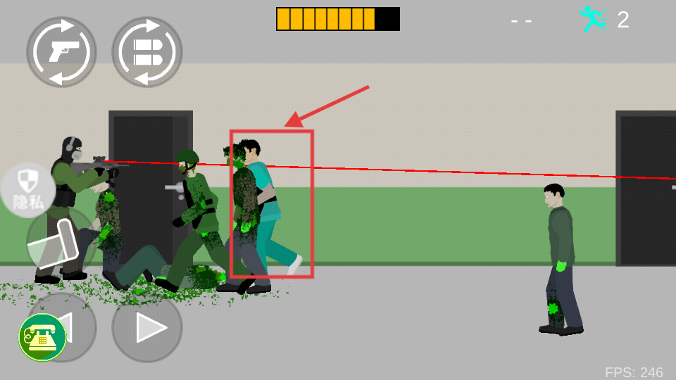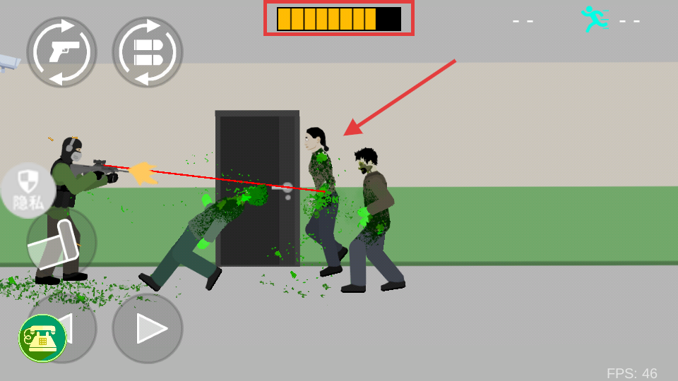 3、战斗时瞄准僵尸射击,避免误击人类,关注上方能量条状态,及时调整射击节奏。