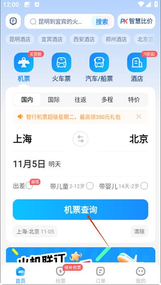 2、在首页选择出发地、目的地及日期后,点击【机票查询】按钮,可查看航班信息。