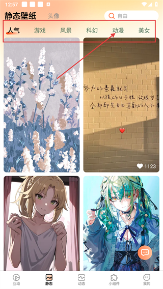 2、进入静态壁纸板块后,可选择【人气】【游戏】【动漫】等分类,这里以【动漫】为例,点击该分类标签。