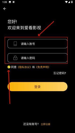 3、在登录页面,输入【账号和密码】并勾选【同意协议】。