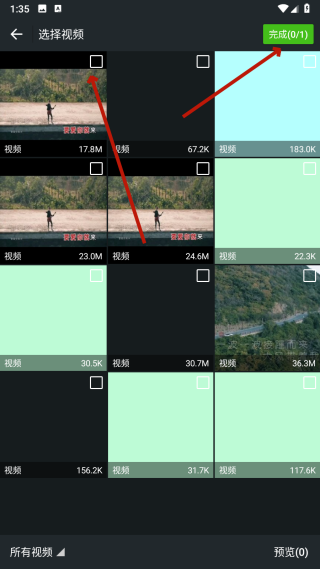 3、在视频选择页面,勾选【目标视频】后点击【完成】,进入视频预览页面。