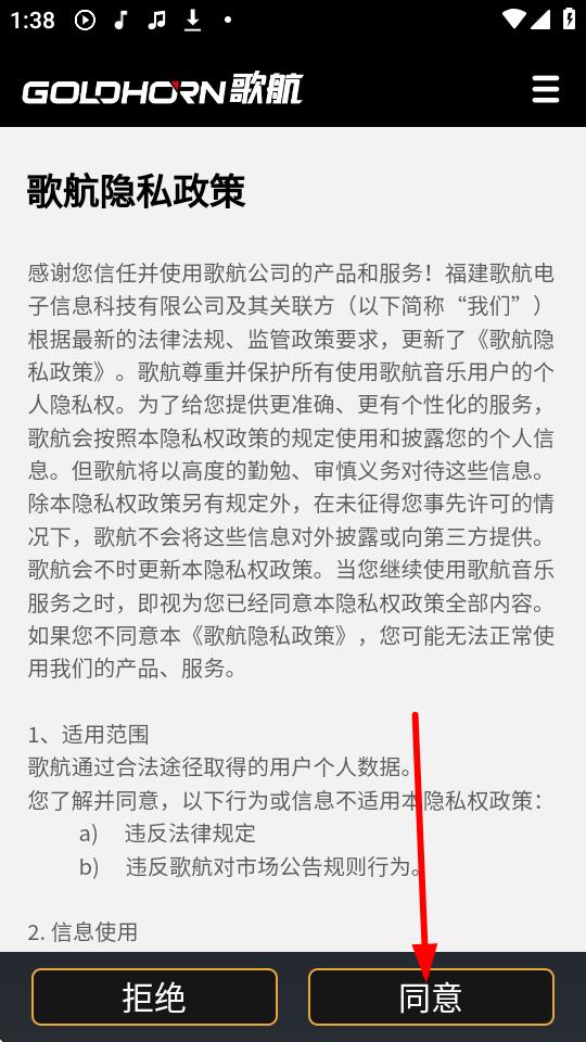 1、首次使用歌航应用时,阅读【歌航隐私政策】后点击【同意】,即可正常使用产品服务。