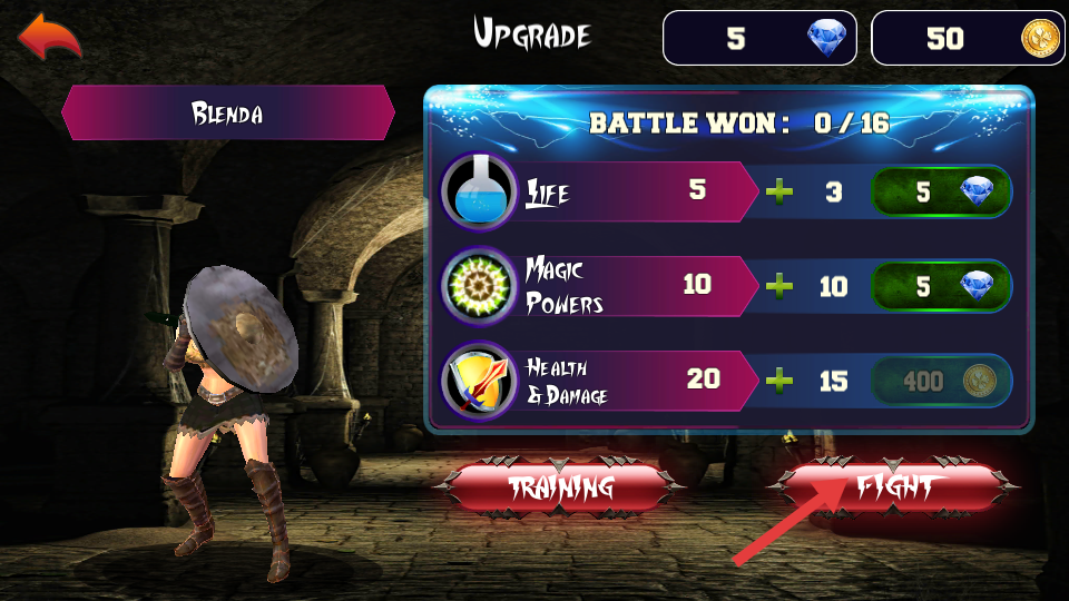 2、升级角色属性,提升战斗能力,点击【FIGHT】准备战斗。