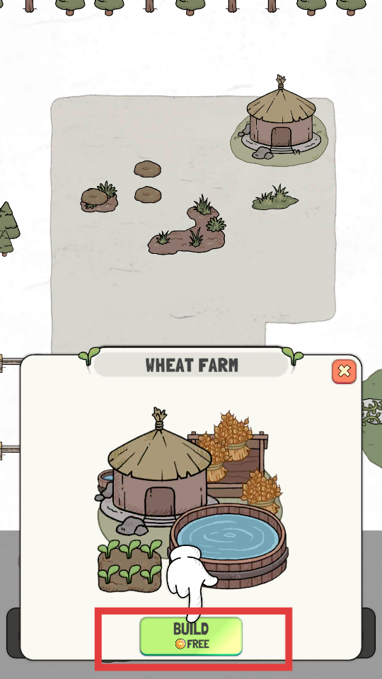 2、在弹出的“WHEATFARM”界面里,点击绿色的“BUILDFREE”按钮,免费建造小麦农场。