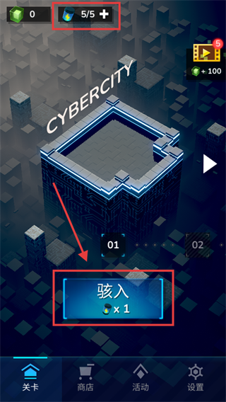 1、点击【骇入】按钮消耗【1】个能源进入关卡,需留意上方能源数量,确保资源充足后开启挑战。