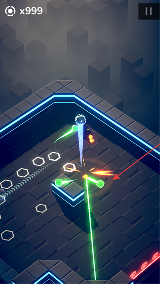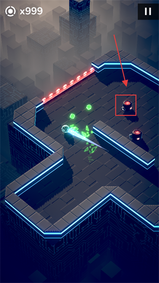4、瞄准红色敌人装置,借助墙壁或特殊柱体弹射调整角度,精准击中敌人,同时收集绿色光点。