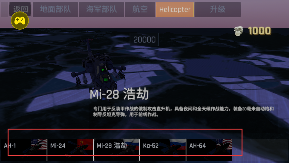 1、在部队选择界面,可选择直升机部队,这些直升机具备不同的反装甲和作战能力,可根据任务需求选择。