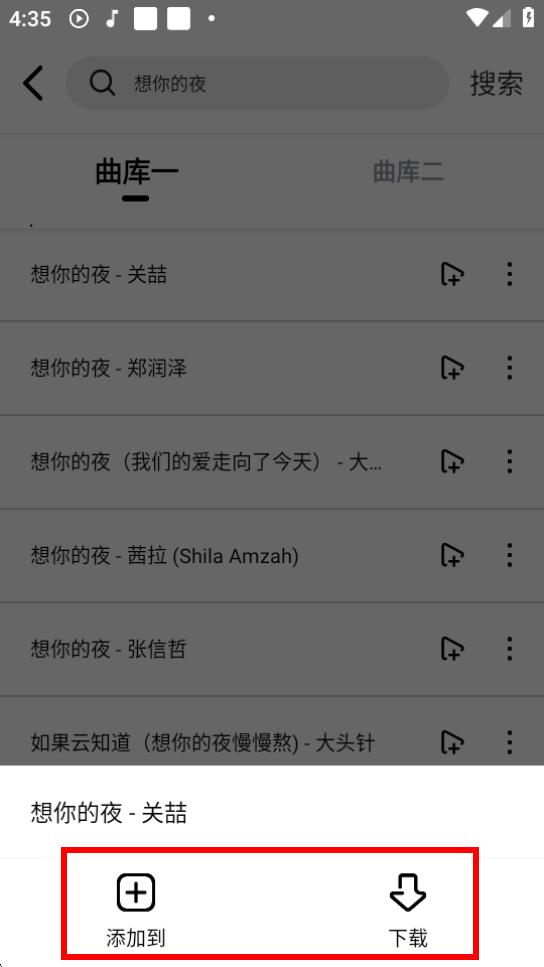 4、在音乐应用中,找到【想你的夜-关喆】后,可点击操作栏进行【添加到】歌单或【下载】歌曲。