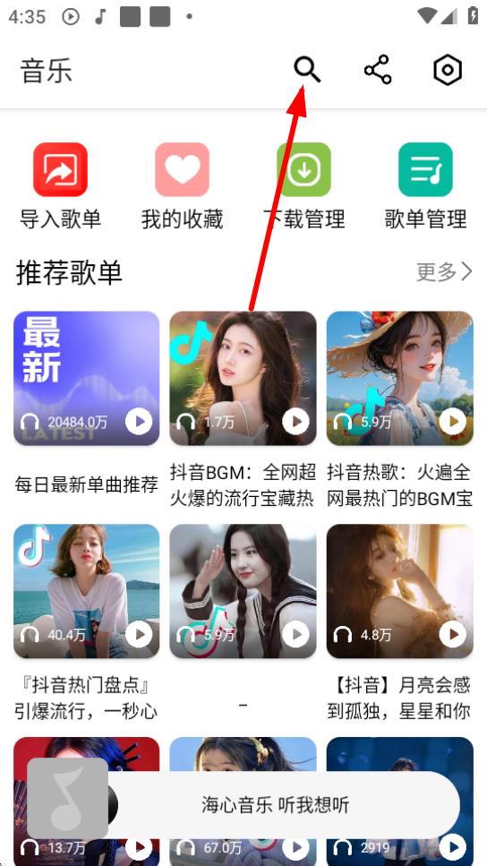 1、在音乐应用主界面,点击顶部的【搜索】图标,可进入搜索页面查找歌曲。